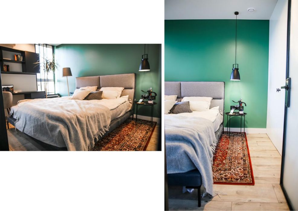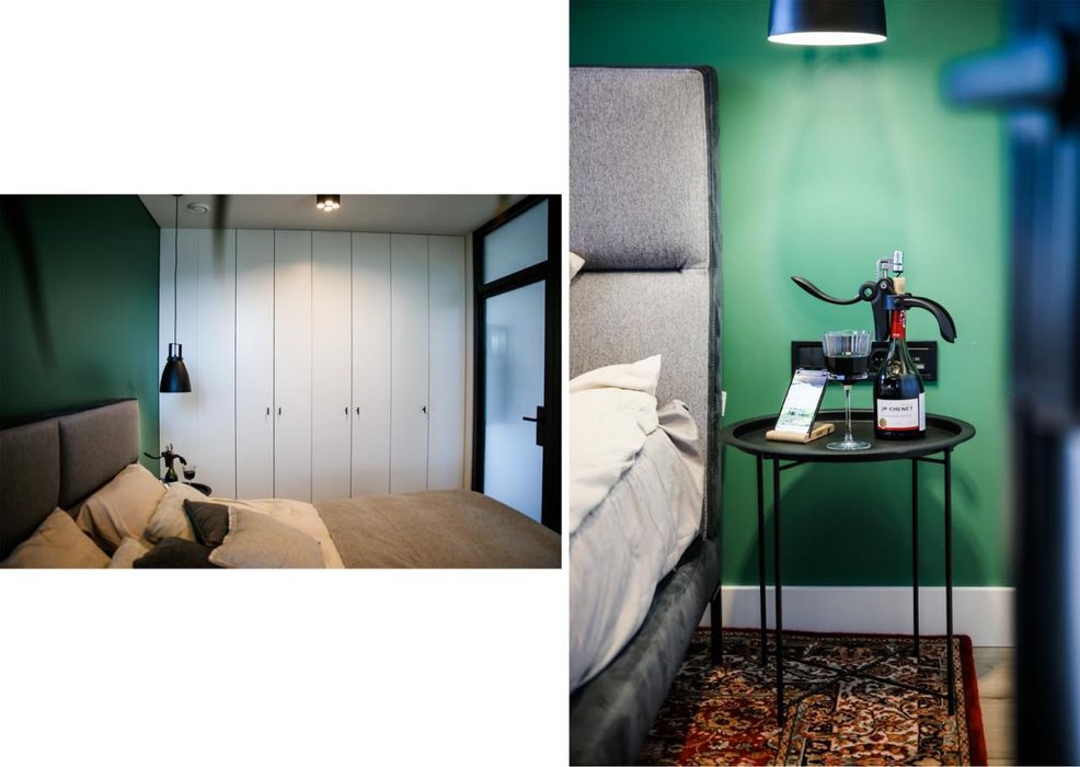 Спальня 14 м2 відокремлена кастомною металевою перегородкою із загартованим склом Кризет – ліжко дизайнерське Blanche, вбудована простора шафа – гардероб від Vavilon, робоче місце, крісло Sandalyeci.