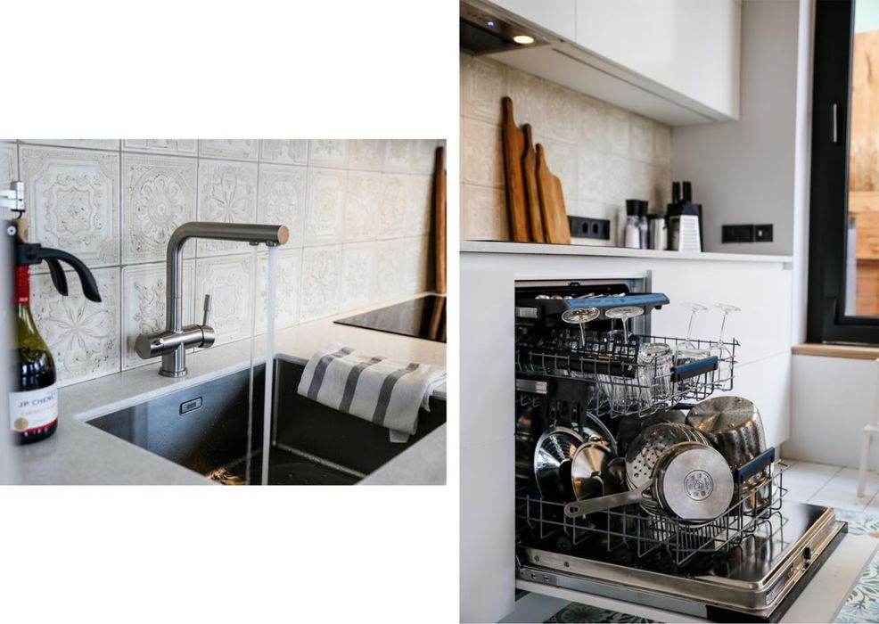 Пральня - сушильна та пральна машини Samsung з топової колекції з високим завантаженням, бойлер на 100 літрів Atlantic c WiFi, зручні відкриті стелажі для зберігання, фільтр на всю вхідну воду, блок вентиляційної машини зашитий естетично в стелі з доступом через люк.