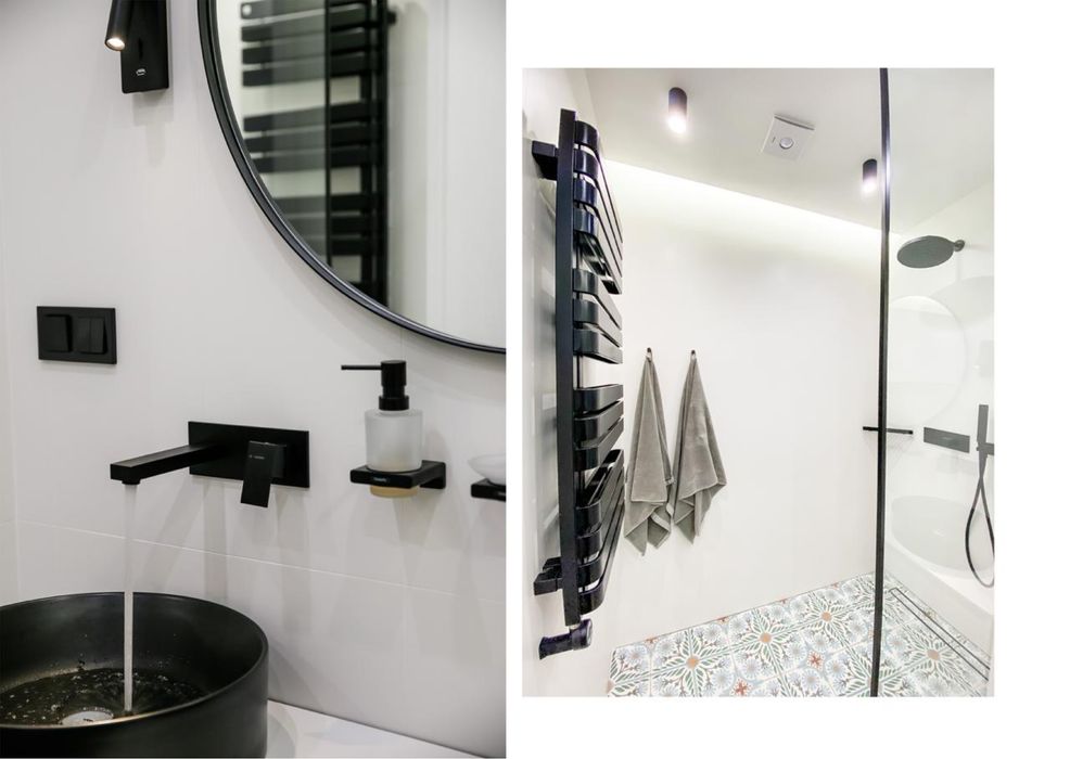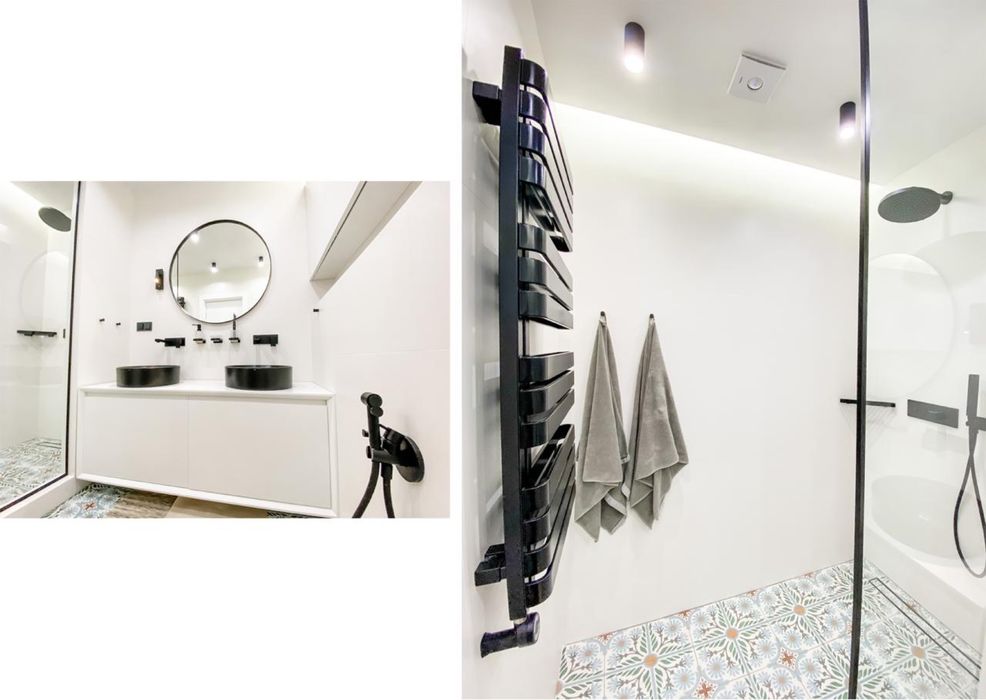 Ванна кімната – вся сантехніка привезена з Італії – два умивальники GSI, унітаз GSI, гігієнічний душ Cristina, змішувачі NewForm, тропічний душ Bossini, змішувач та лійка Cristina – все імпорт з Італії у стильному чорному матовому кольорі. Усі аксесуари - Hansgrohe. Душова скляна шторка з водовідштовхувальним напиленням від крапель - Liberta.