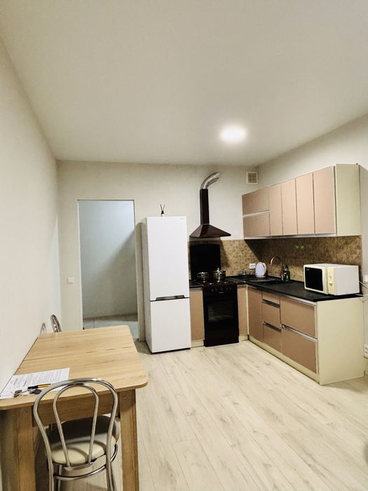 Це простора кухня-студія з виходом на лоджію, великий санвузол з ванною. Квартира повністю мебльована та укомплектована всією необхідною побутовою технікою.