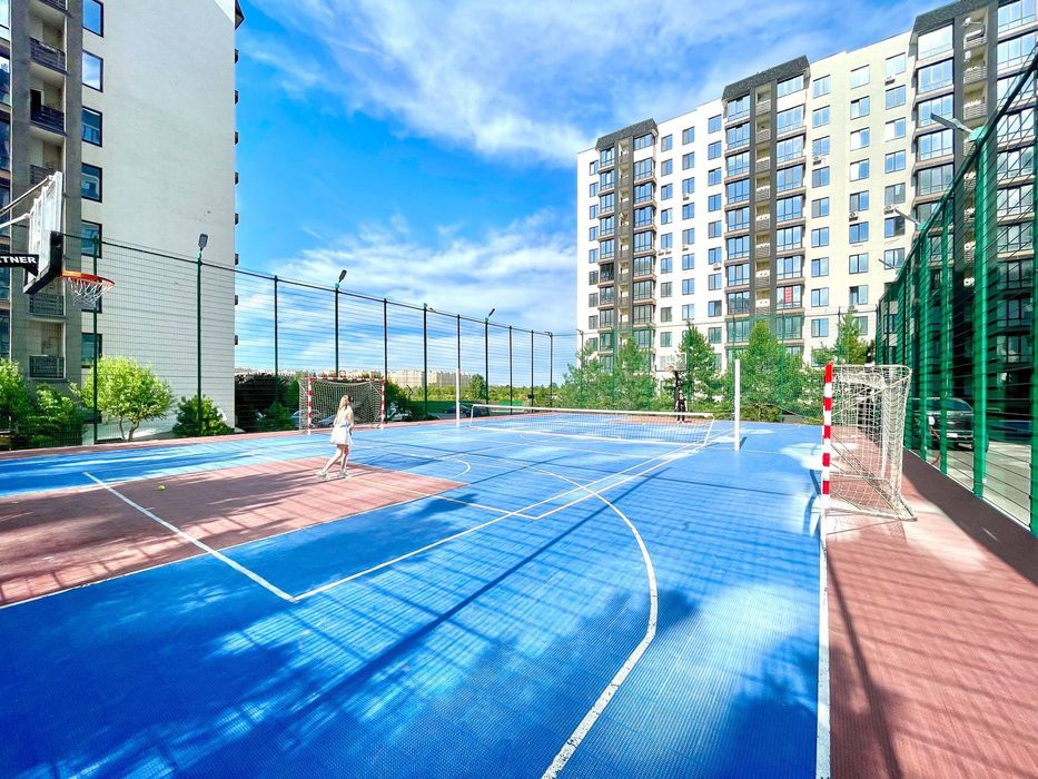 На території знаходяться *безкоштовно* тенісні корти, футбольні площадки, зони з батутами для дітей, басейн, територія облагороджена зеленими насадженнями. Квартира ідеально підійде людям котрі шукають комфорт, затишок.