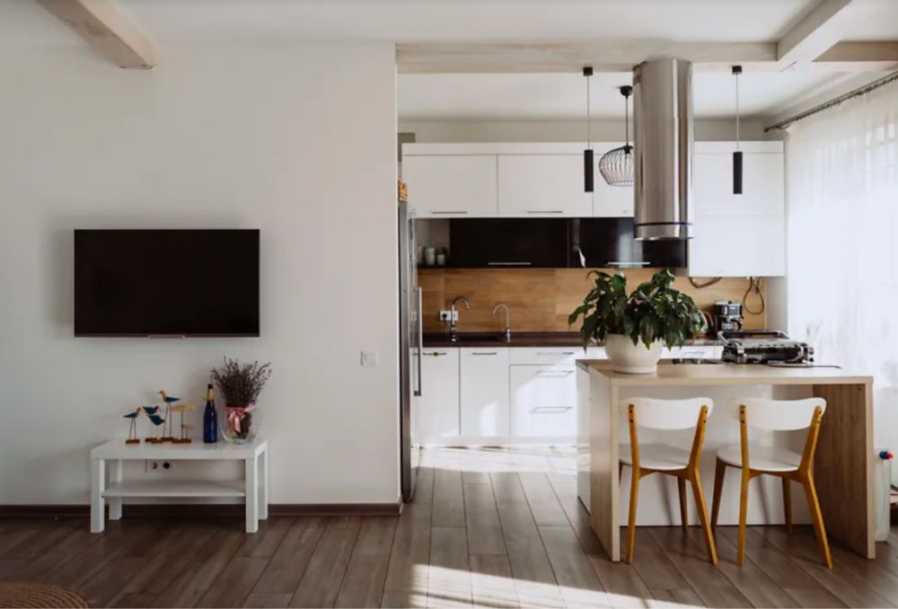 Перший поверх- велика кухня студія, з діючим каміном, який можна використовувати як альтернативний обігрів будинку. З кухні вихід на терасу який веде до новоствореного парку. Також на першому поверсі санвузол та великий підвал, виведено усе під генератор та зарядку для електромобіля.