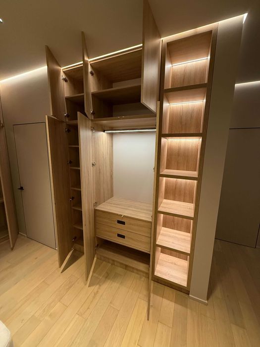 Підлога з натурального паркету, диван та ліжко фірми Blanche, сантехніка Galassia та Bruma, всі шафи, вітрини та кухня виготовленні під замовлення.