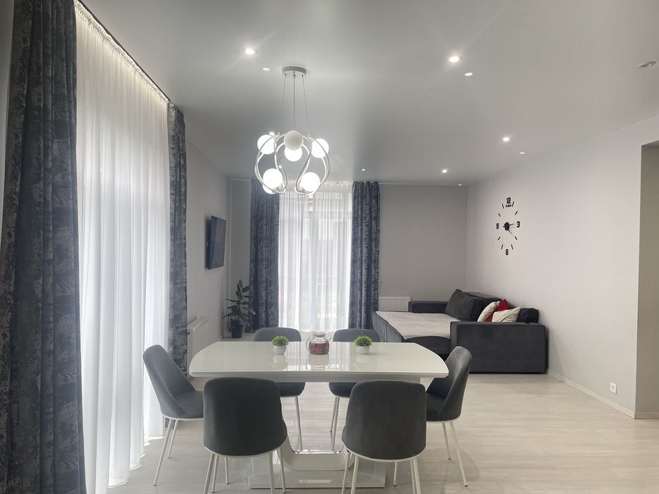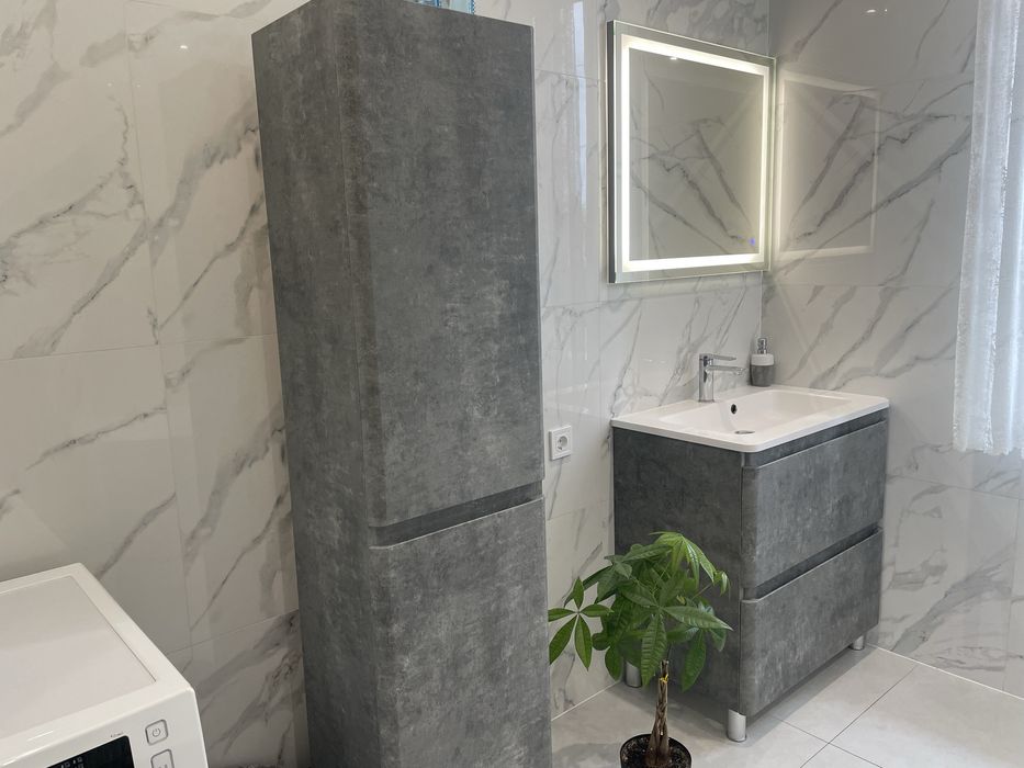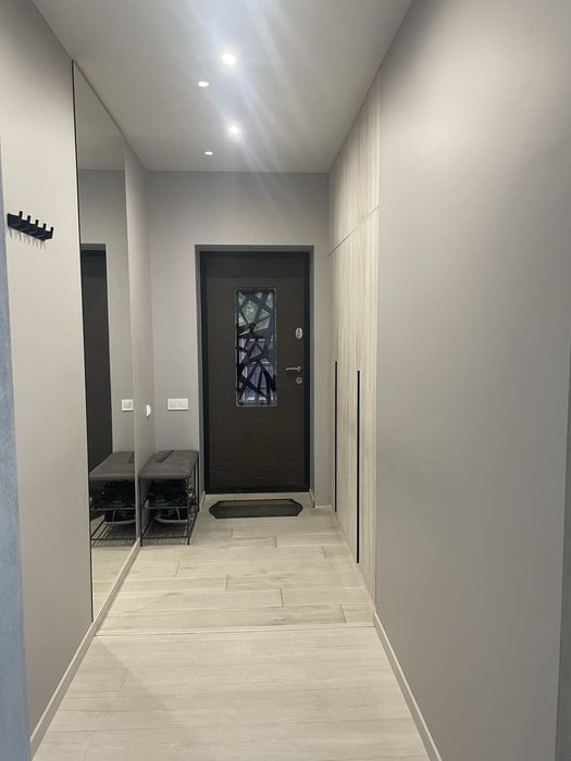 Ремонт выполнен в светлых тонах с добавкой серого современного цвета.