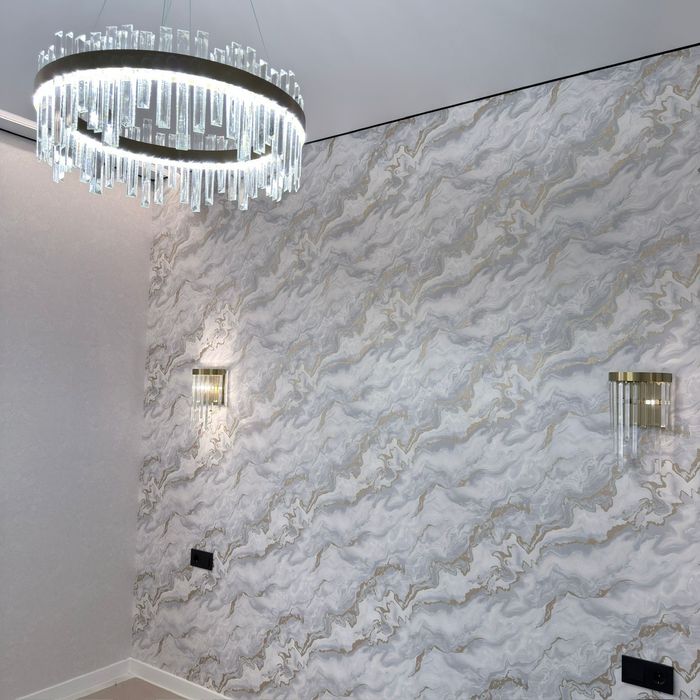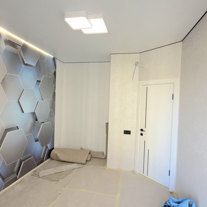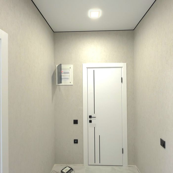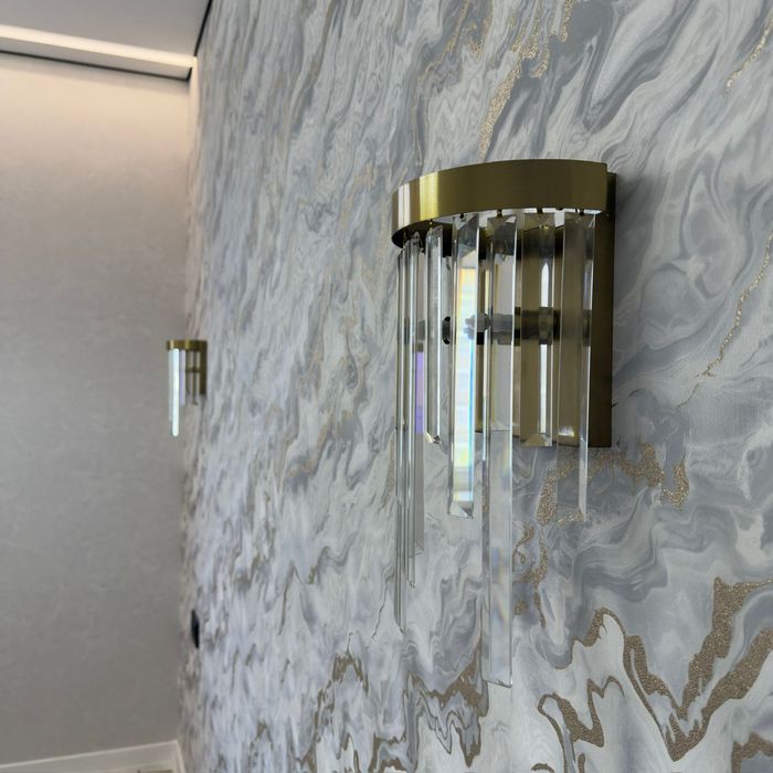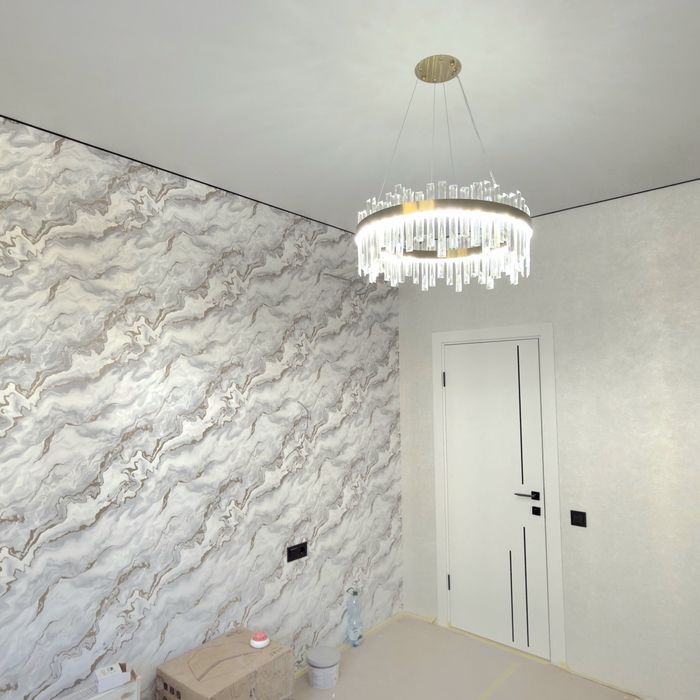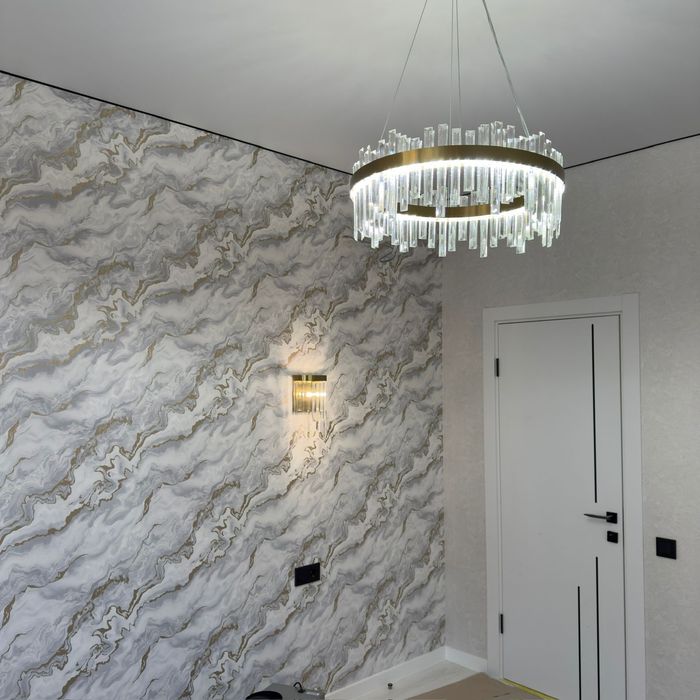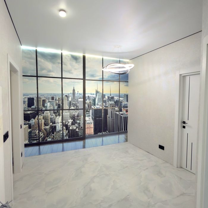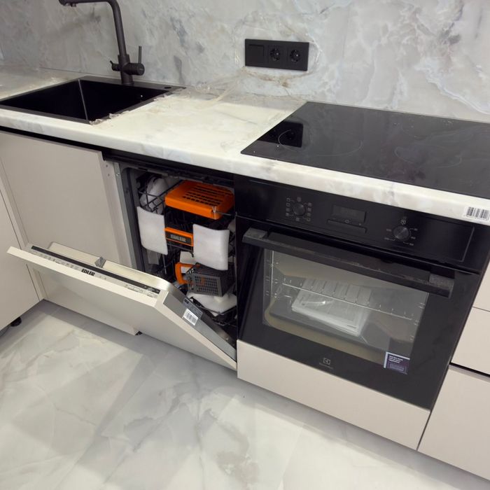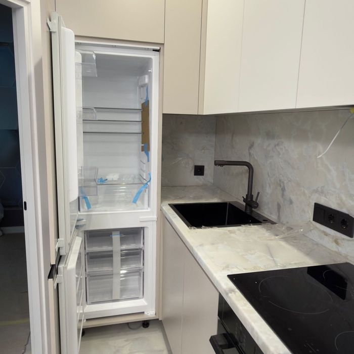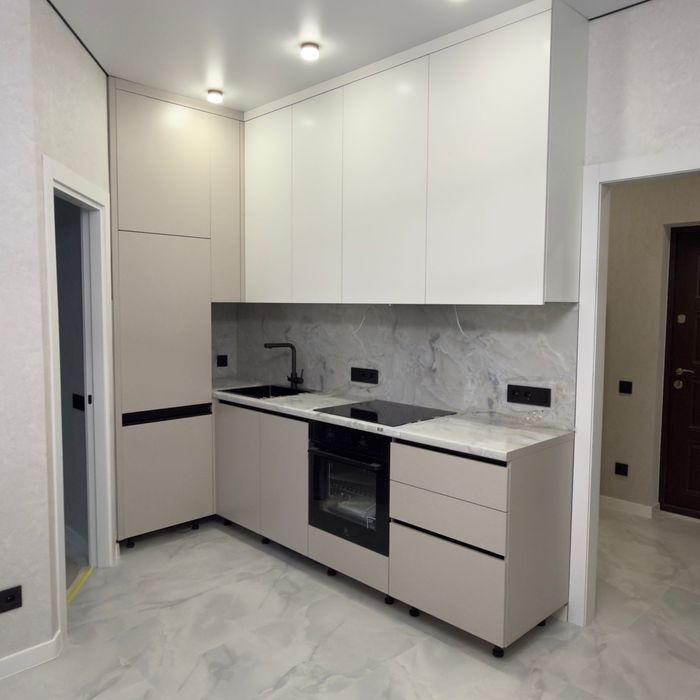 Встроенная кухня со встроенной техникой. Шторы, люстры,
