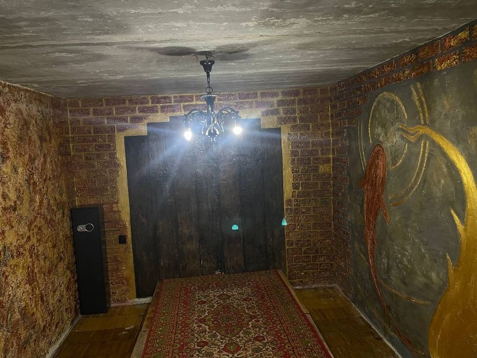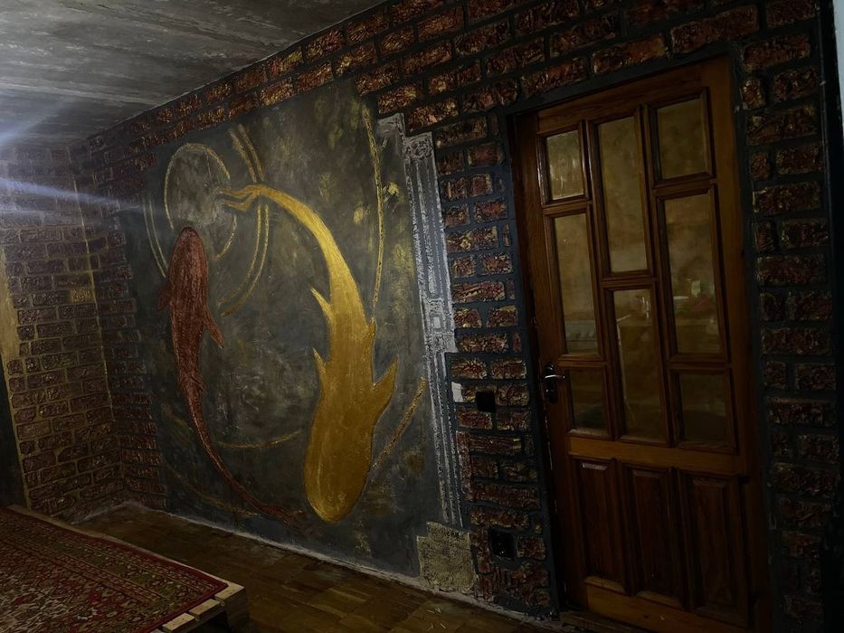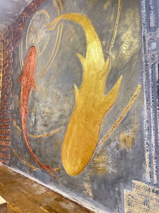 • Оригинальный дизайн стен — декоративная штукатурка, роспись в стиле лофт/индастриал (рыбы, золото, кирпичная текстура);