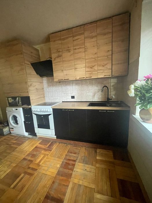 • Просторная кухня с новой мебелью и техникой (встроенная плита, вытяжка, духовой шкаф, раковина с черным краном, место под стиральную машинку);