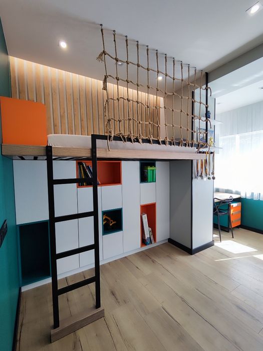 Меблі виконані з Австрійських преміум матеріалів, всюди фурнітура Blum преміум, в дитячий каркас меблів - массив дерева + металеві конструкції.