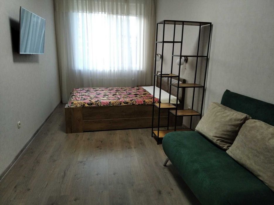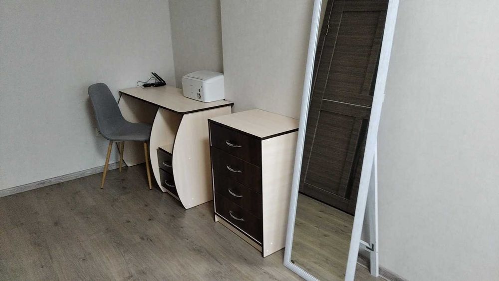 У кімнаті: кондиціонер, плазма, роутер, ліжко з ортопедичним матрасом, приліжкова тумба, стелаж, розкладний диван, письмовий стіл, комод, дзеркало на весь зріст.