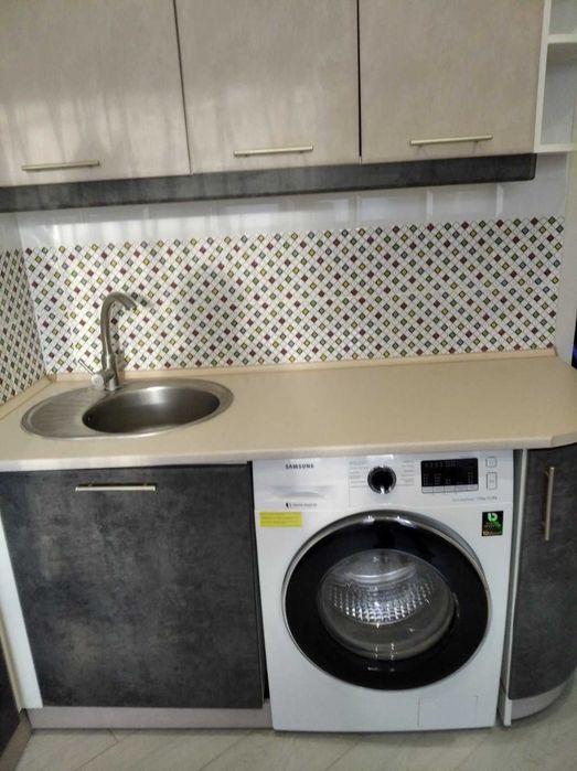 На кухні: холодильник, мікрохвильовка, чайник, пральна машина, вбудований очисник води, електроплита, духовка, ще один розкладний диван, стіл і стільці, додаткове освітлення над робочою поверхнею.