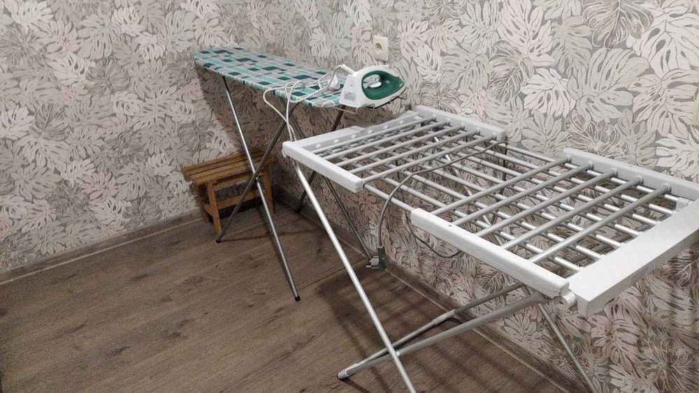 У гардеробній: шафа, стійка для одягу, дошка для прасування і праска, електронна сушарка.