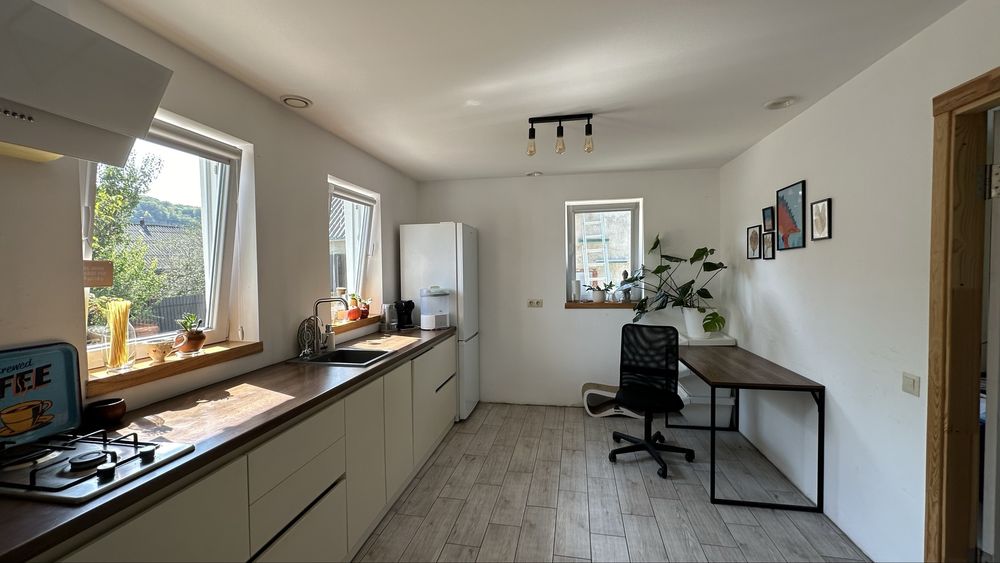 електричні керамічні обігрівачі, якщо палити тільки ними до 25 градусів, виходило близько 4000 грн на місяць взимку. Дров'яна пічка в серці дому, тепло від неї доходить до усіх кімнат, якщо палити щодня чи через день. На дворі є трохи дров. У маленькій кімнаті - тепла підлога під столом, можна гріти ноги коли працюєш.