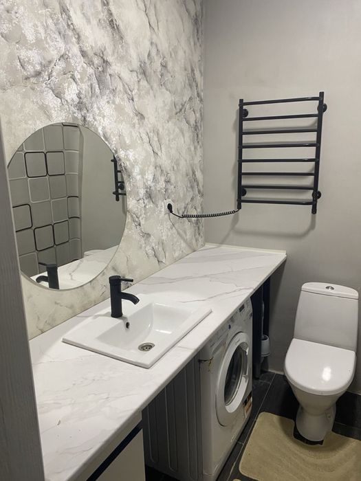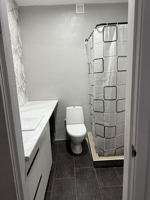 Ванна кімната :душова, велика стільниця з раковиною, туалетом та пральною машинкою. Є гаряча вода -бойлер.