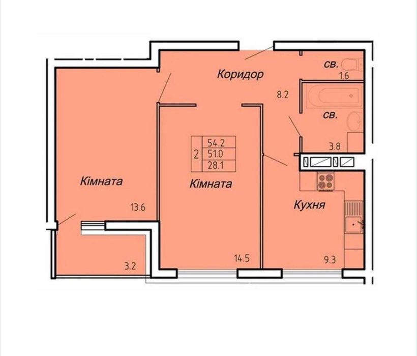 - Площа — 54.2 м²