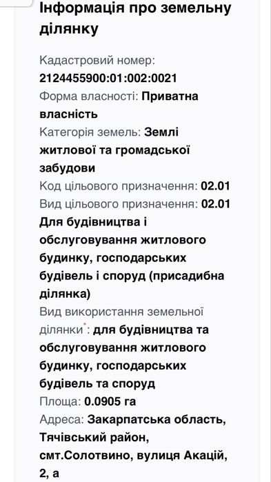 Продаж земельної ділянки в Солотвино; Продаж земельної ділянки Тячівський район, смт.Солотвино, вулиця Акацій 2а, в районі Солені озера. Цільове призначення : для будівництва і обслуговування житлового будинку, господарських будівель та споруд. Загальна площа 0,0905 га. Тиха та затишна локація. Всі деталі за телефоном.; кадастровий номер: 21244559900:01:002:0021