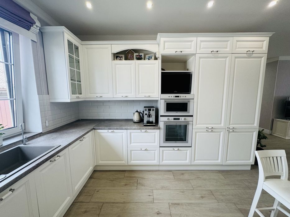 Велика кухня студія з каміном обладнана меблями і технікою провідних виробників (Merx, Smeg, Liebherr, Bosch, Whirlpool)
