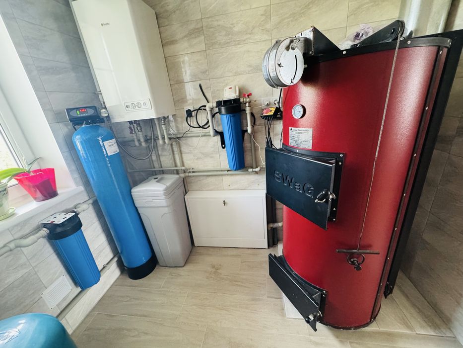 Опалення і підігрів води від газового двоконтурного котла, але додатково є твердопаливний котел і бойлер.
