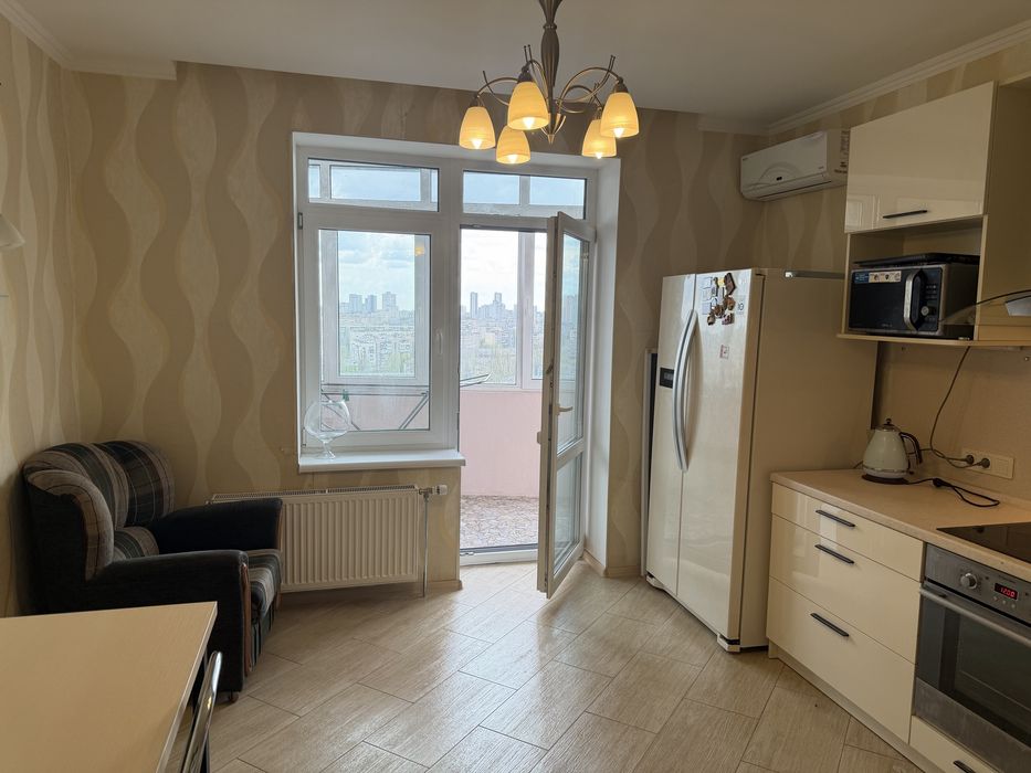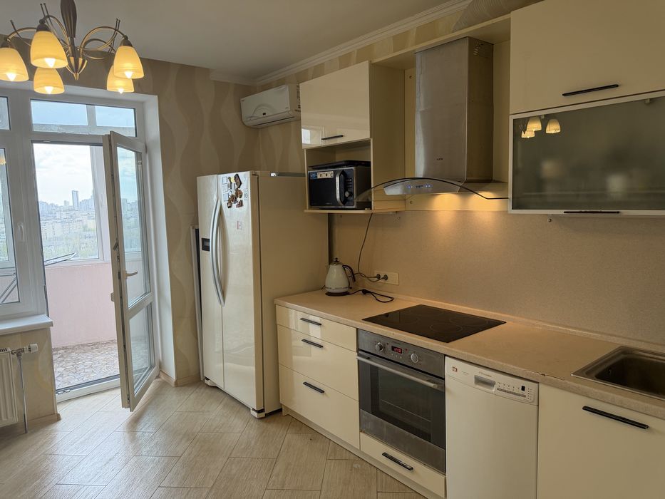 Кухня велика з балконом, великий холодильник Side-by-side , духова шафа, варильна поверхня, витяжка, мікрохвильовка, електрочайник, телевізор.