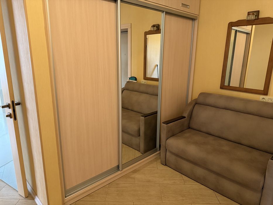 Просторий коридор з розкладним диваном. Дві шафи купе, одна з шаф з дзеркалом.