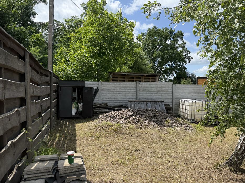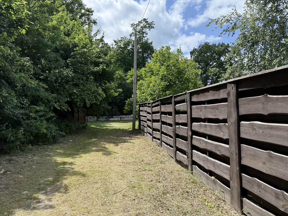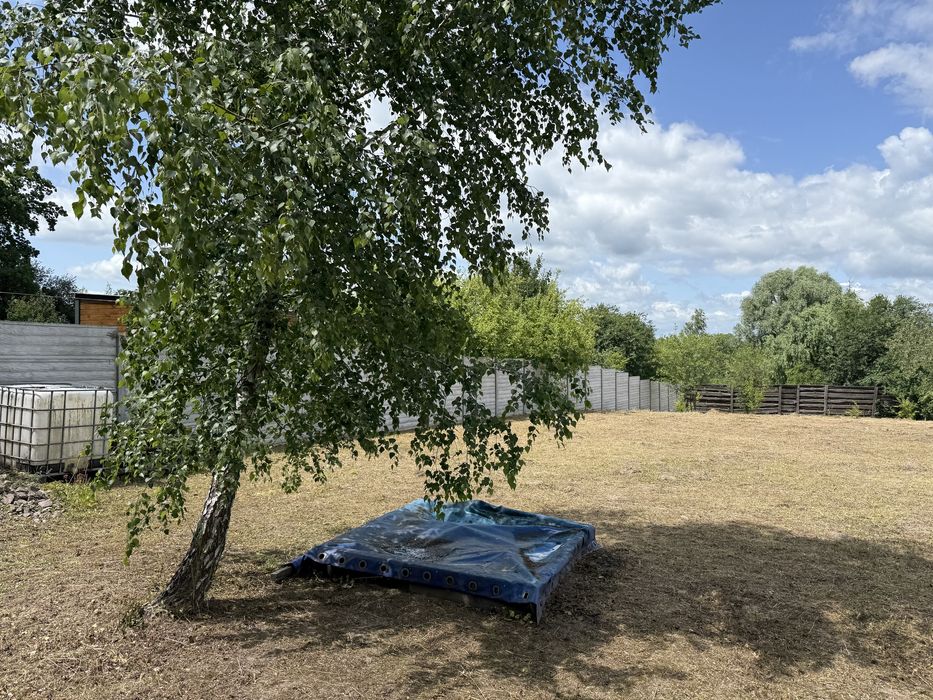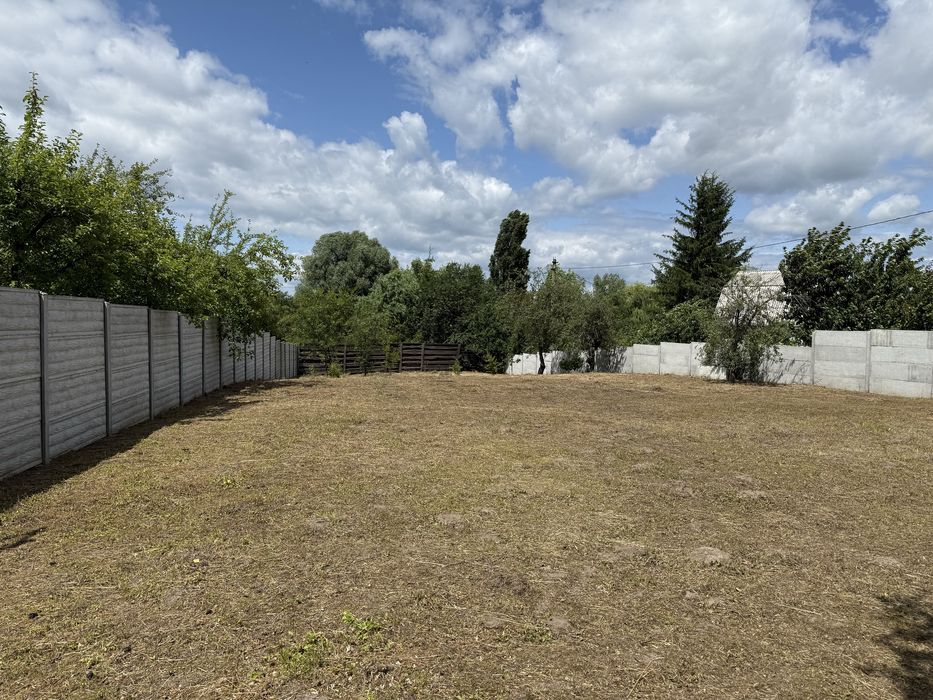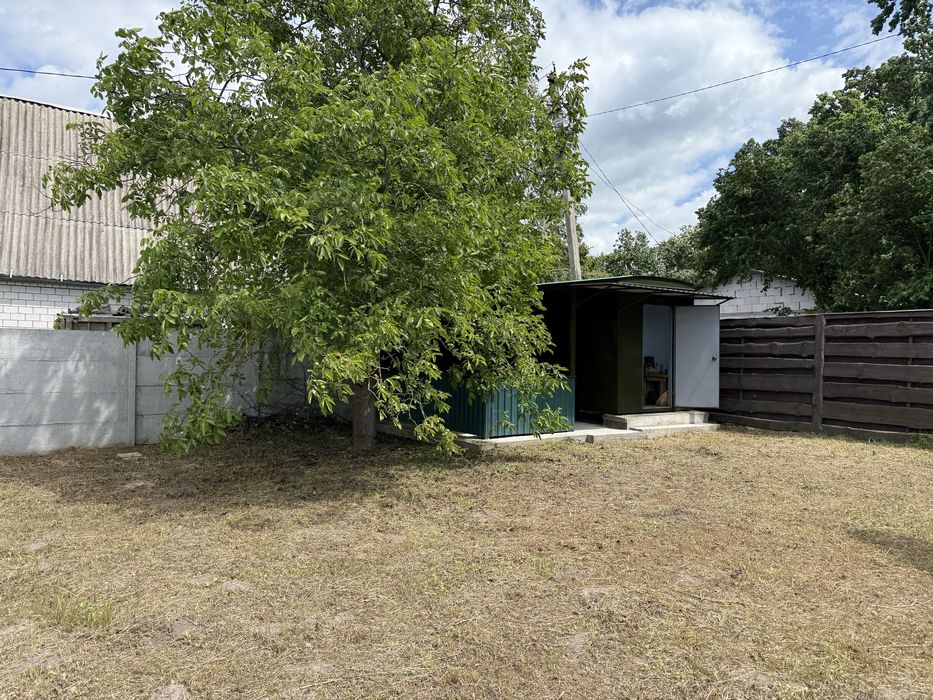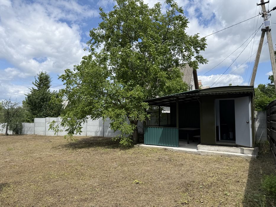 Окремо вагончик для садового інвентаря. Світло проведено. Присутні фруктові дерева. Ділянка огороджена бетонним забором 2м., фасадні з дерева 2м.