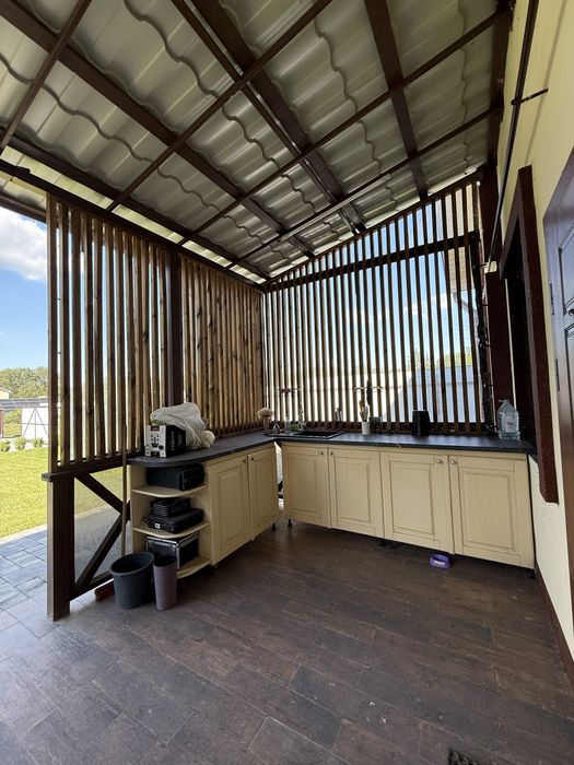 Строился с кирпича, утеплен пинопласт 10 , полистирол фундамент в 2024 году, 3-х камерные стеклопакеты,летняя терраса с кухней , горячей водой, мангальная зона, гараж на 2 машины, Електро ворота , газоны , авто полив, ночное освещение, освещение на подшивах,камеры, охрана, складские помещения, отдельно котельная, 2 септика, скважина