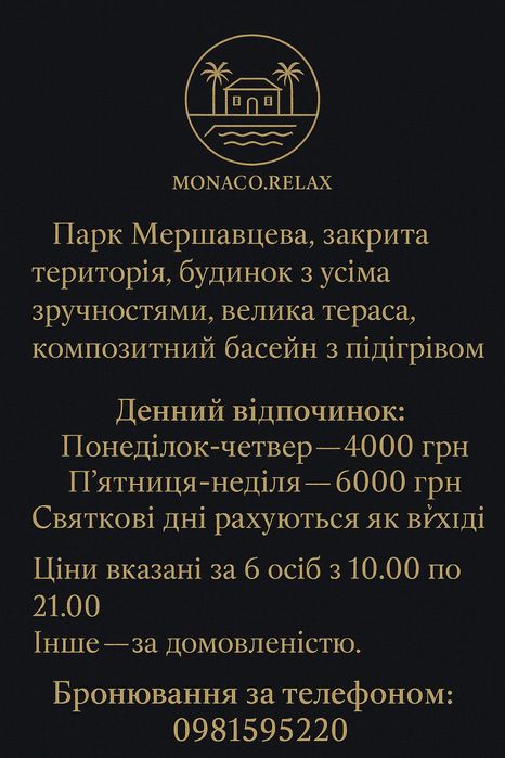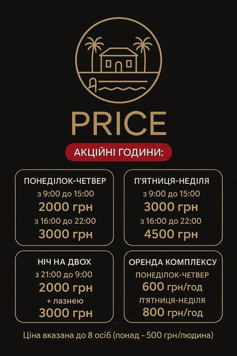 Ціна вказана з 11.00 до 21.00, 6 гостей, інші умови за домовленістю.
