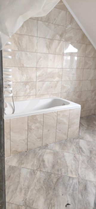 Зробрено: всі роботи по електриці, сантехніці. плитці зроблені. Дві ванни також готові на першому і на другому поверсі і потолки також.