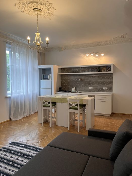 Одна кімната ізольована, інша прохідна, велика кухня-студія (32 м²).