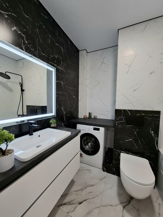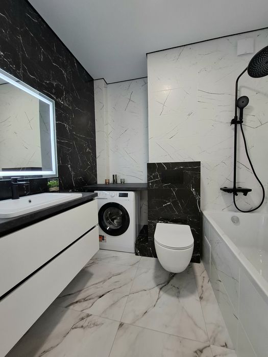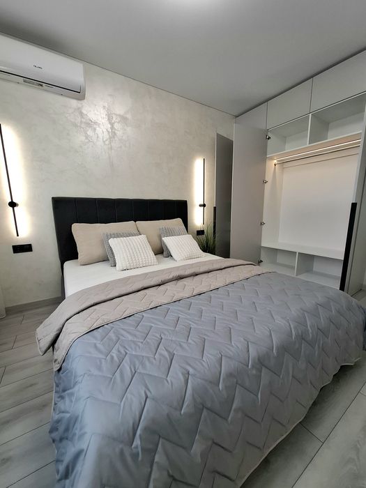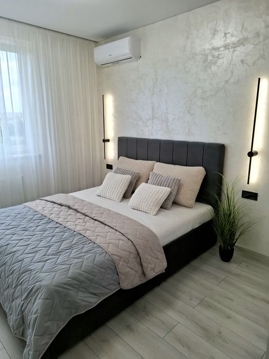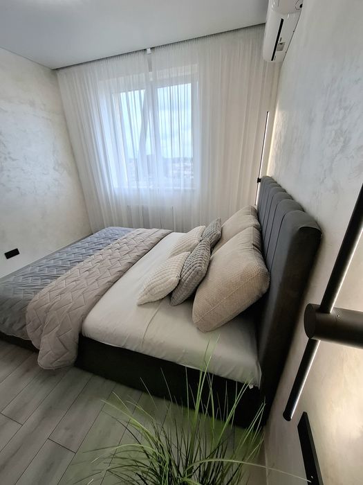 Квартира укомплектована всією необхідною технікою та меблями для комфортного проживання, а саме : Вбудована кухня з витяжкою, газова варочна поверхня, духова шафа, мікрохвильова піч з функцією гриль, посудомийна машина, вбудований холодильник, стіл та стільці, розкладний двухспальний диван, двоспальне ліжко з підйомним механізмом, простора шафа з підсвіткою, встановлений інверторний кондиціонер, пральна машина, телевізор зі смарт TV.