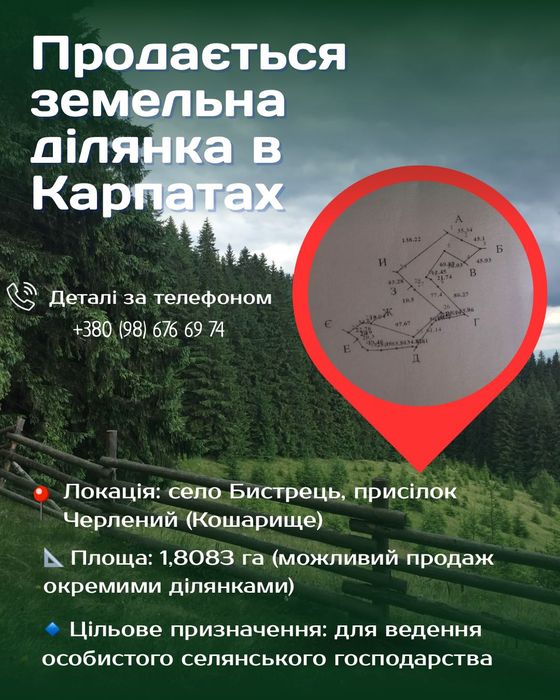 Ділянка розташована у мальовничому куточку Карпат, з красивими краєвидом на Чорногірський хребет та чистим повітрям. Ідеально підійде для створення садиби, еко-туризму або ведення господарства. Від власника.
