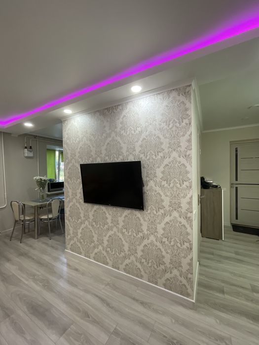 Заменена проводка,выровненные стены, частично тёплый пол,заменены все коммуникации, окна,обои под покраску, заменены батареи