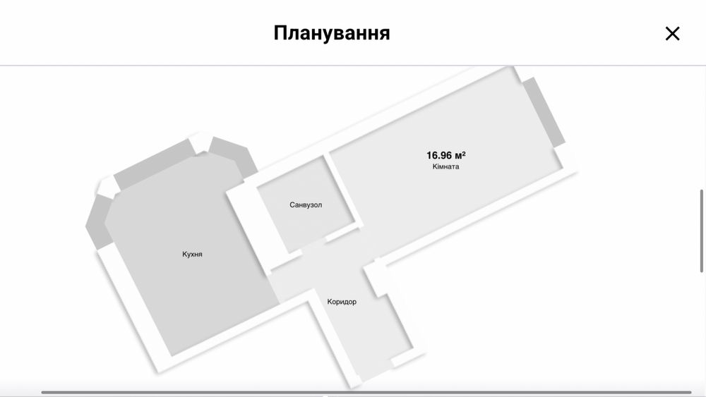 Площа – 45 м². Планування – розпашонка: кімната та кухня виходять на дві сторони, що забезпечує хорошу вентиляцію та денне світло протягом дня.