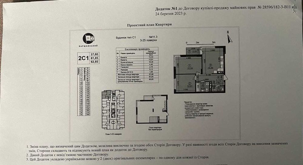 Квартира загальною площею 62,85 кв.м., має функціональне планування, кухня-вітальня-18,46 кв.м., дві окремі кімнати 15,59 та 12,01 кв.м, санвузол 2,18 кв.м, ванна кімната 4,48 кв.м., коридор 9,13 кв.м., балкон 1 кв.м - вихід з кухні-вітальні.