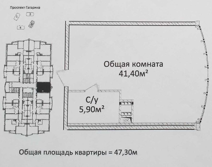 Площадь 47,3 кв.м, планировка - студия с панорамным остеклением. Квартира по периметру обесшумлена, качественная электрика (автоматы и диф.автоматы), проведен интернет (оптоволокно).