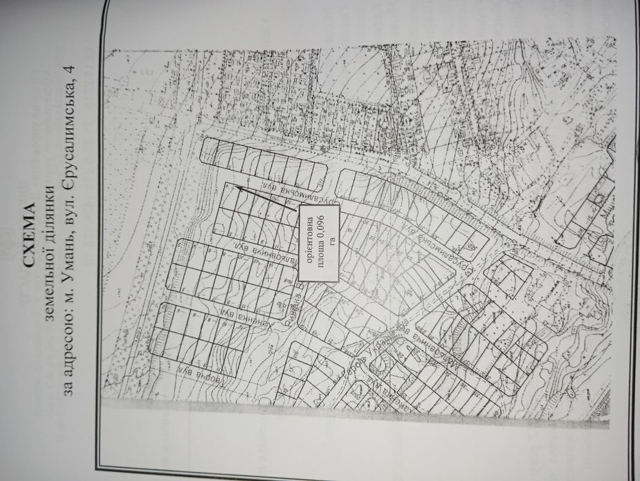 Земельна ділянка м. Умань; Терміново. Земельна ділянка 0,096 соток, розташована в м. Умань по вул. Єрусалимська, 4. Правильної форми, рельєф рівний, вільна від забудови. Вид використання: для будівництва і обслуговування житлового будинку, господарських будівель і споруд. 0.**************81.