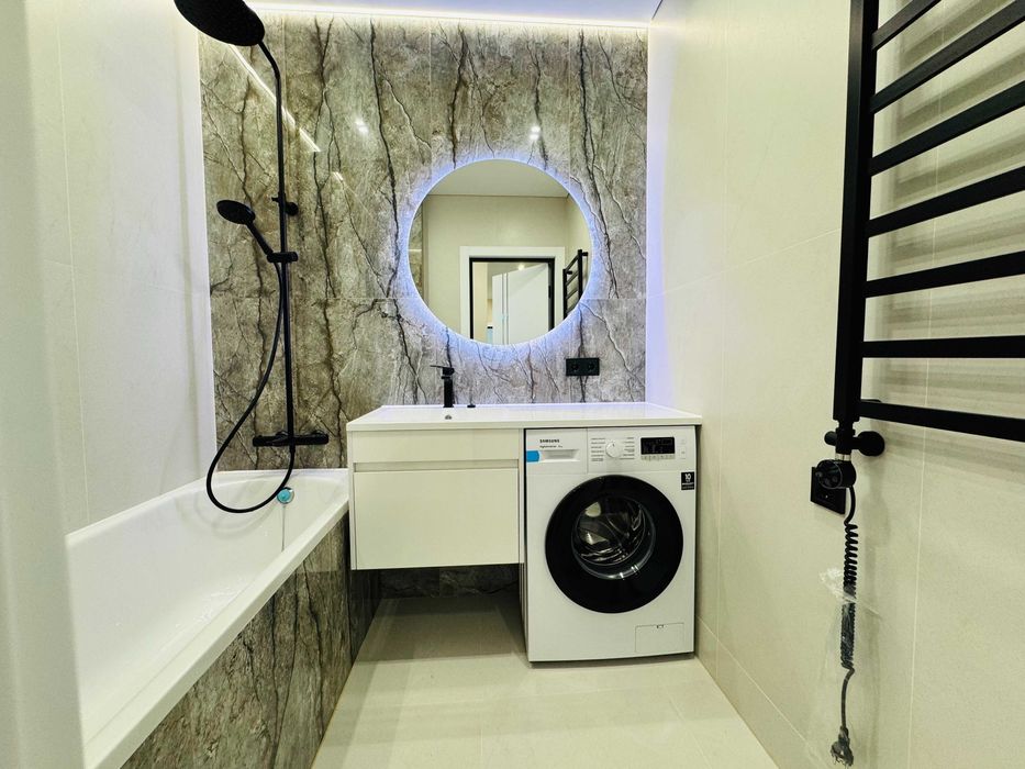 Ванна кімната - 3.5 м² : пральна машинка, умивальник, тумба, дзеркало з підсвіткою, рушникосушка (може працювати від котла та від електрики), ванна, душ.