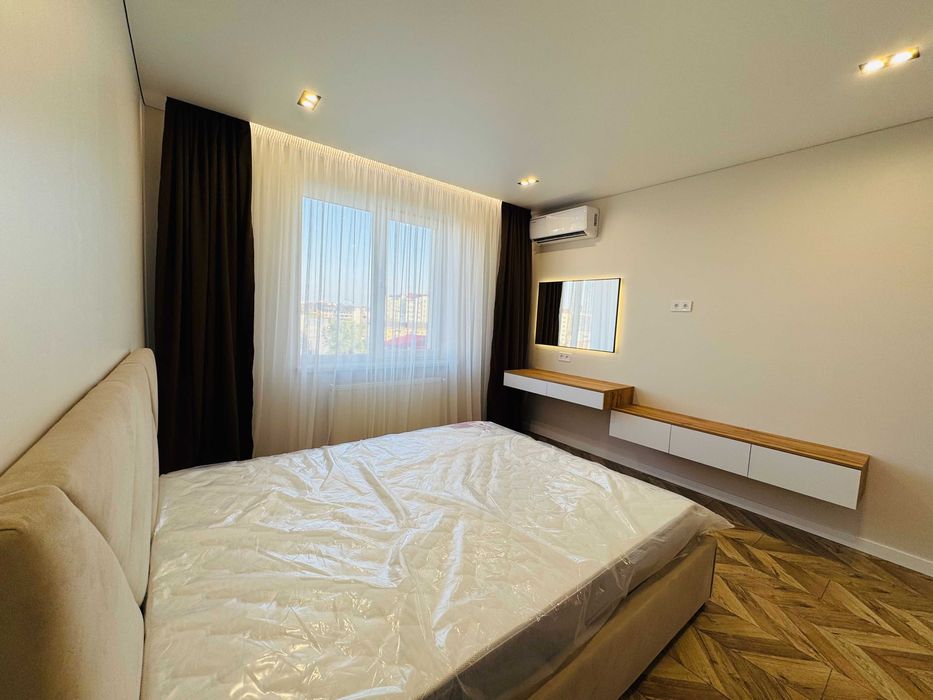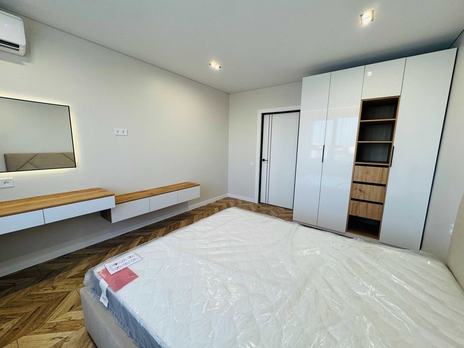 Спальня - 15.3 м² : двоспальне ліжко з матрацом, функціональна шафа, стильна б'юті-зона з дзеркалом із підсвіткою та тумбою, кондиціонер.