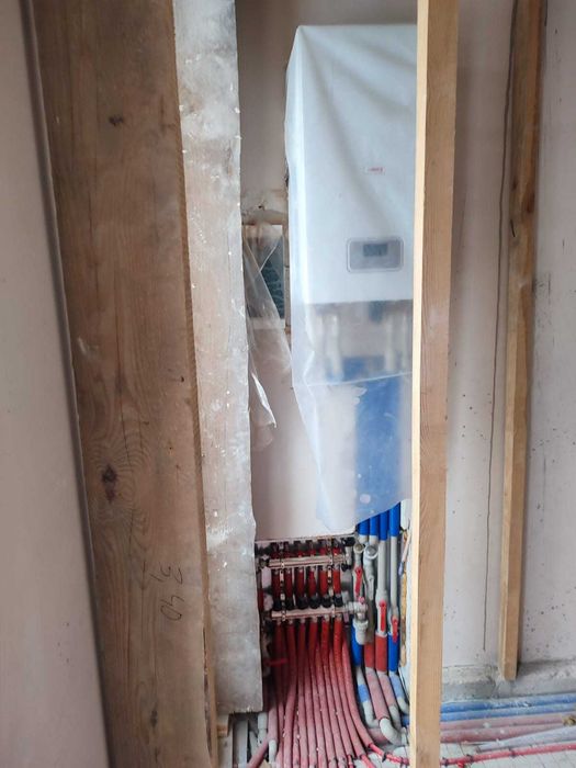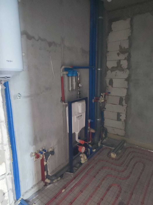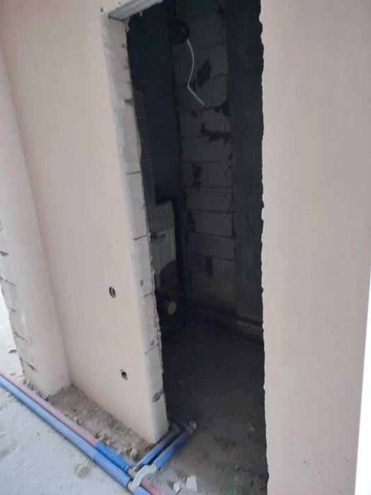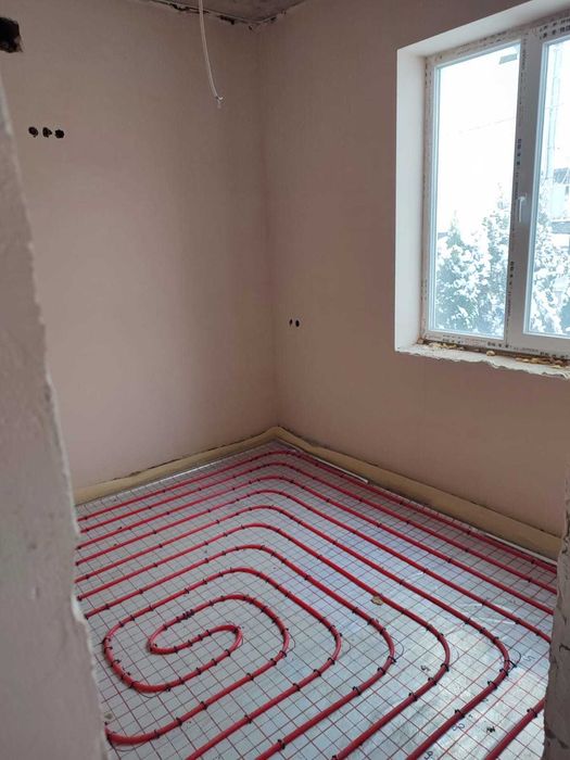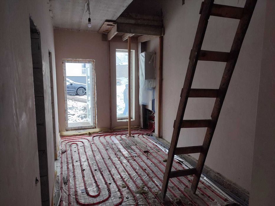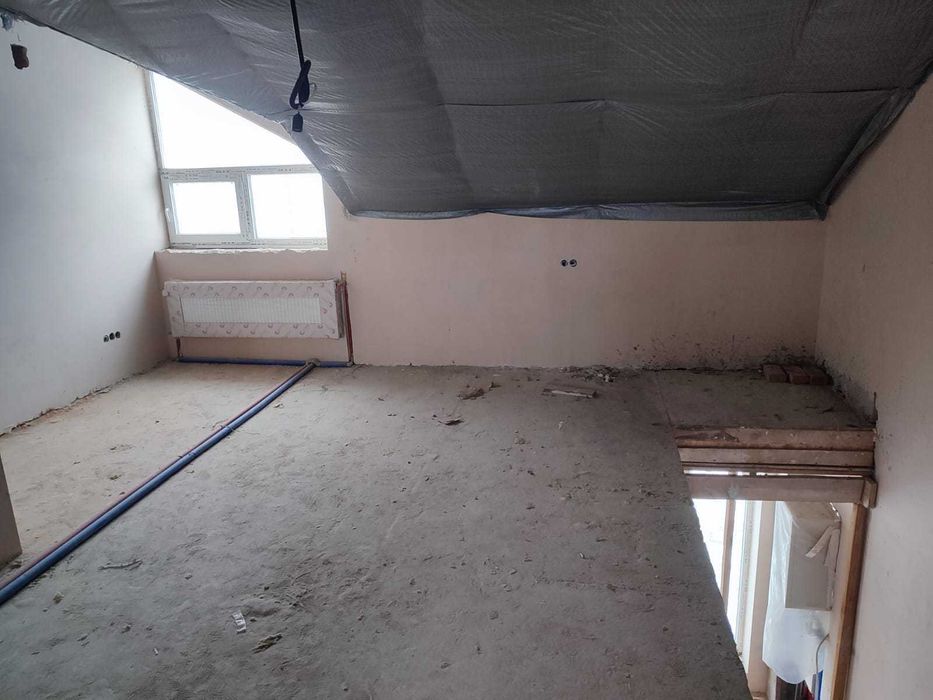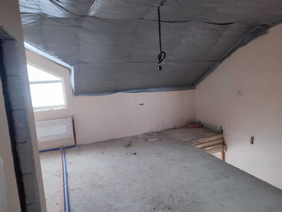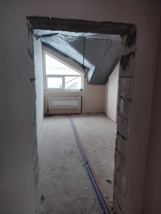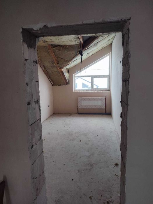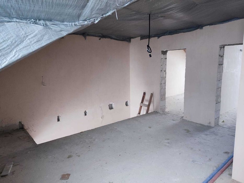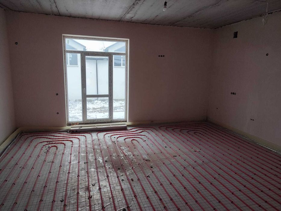 Планування перший поверх велика кухня вітальня з величезним панорамними вікнами, виходом на задній дворик з терасою, також на першому поверсі є кімната 9,5 кВ.м. і санвузол. Також встановлений електрокотел, деякі роботи зроблені по монтажу в санвузлах і проведений монтаж труб для теплої підлоги. Встановлені радіатори по всьому будинку.