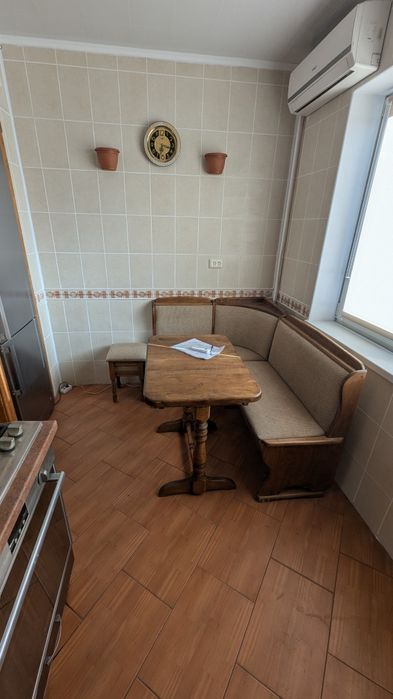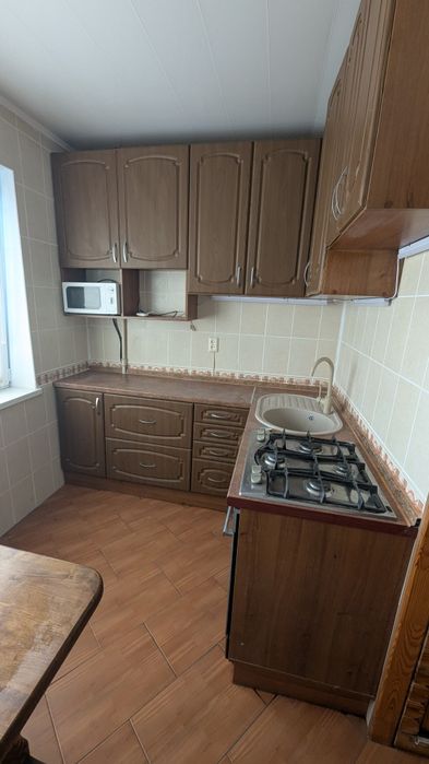 Меблі: кухня, кухонний куток, стіл, 2 стільці, шафа купе, ліжко + матрац, тумба для взуття, шафа + сушка на балконі + м'яке місце для відпочинку.