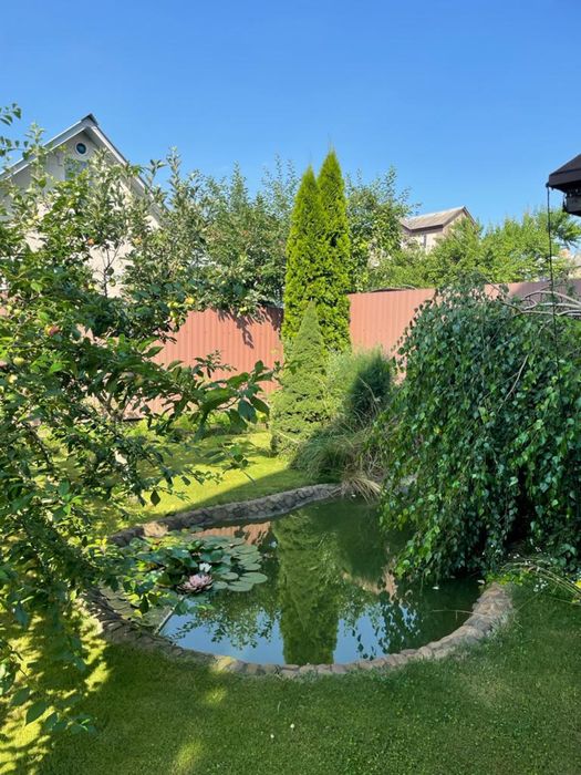 Ділянка 6 соток на якій є плодово-ягідний садок , ландшафтний дизайн з невеликим озерцем, дерев'яна альтанка на 8 посадочних місць, автополив газону, вигрібна яма з переливом на 15 куб. ,автоматичні ворота та навіс з майданчиком для паркування двох авто.