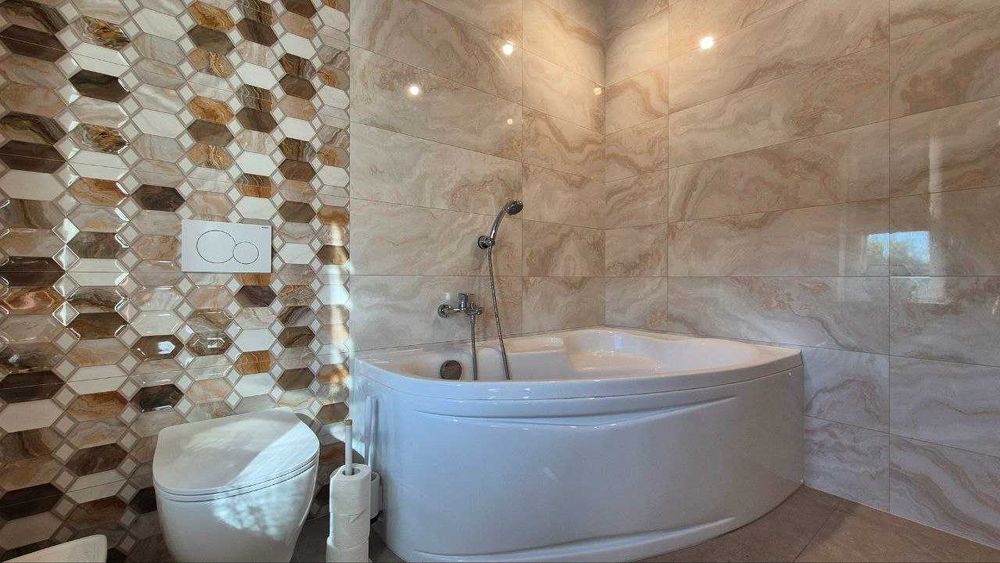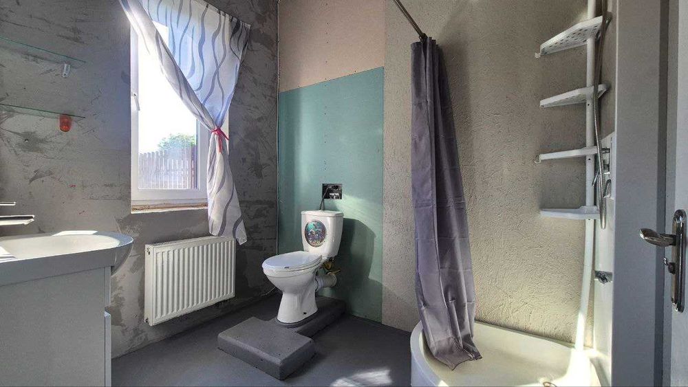 - другий поверх – підлогу покладено повністю – також таку саму ламіновану МДФ-дошку з «тихою ходою» + керамогранітну плитку у санвузлі, там лишилося завершити тільки стелю. На стінах згідно з проєктом якісно покладено плитку з підрізкою зовнішніх кутів під 45 градусів. Встановлено акрилову кутову ванну з додатковою шумоізоляцією, підвісний унітаз з інсталяцією та електричну рушникосушарку. У санвузлі першого поверху – встановлено інсталяцію під майбутній постійний унітаз (наразі є тимчасовий). Раковина та душовий піддон - також тимчасові. Під душ встановлено вже постійний змішувач, якісний, також є душові трапи для зливу майбутнього душу – не встановлені, але готові лишити їх новим власникам. На другому поверсі також є двоє дверей прихованого монтажу під фарбування та фотошпалери.