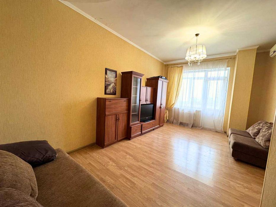 - Просторная планировка: кухня - студия с диваном и спальным местом, гостиная полноразмерная, просторный санузел, застекленный балкон с видом на полоску моря.