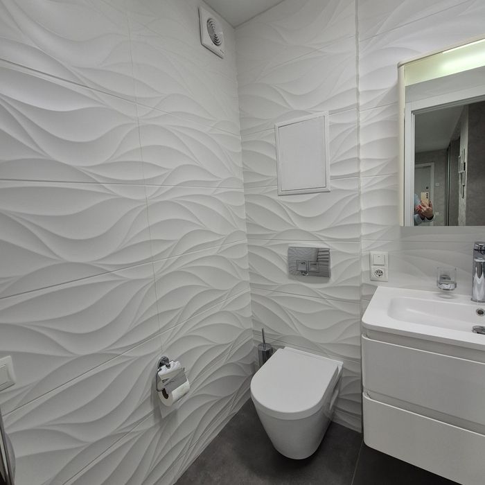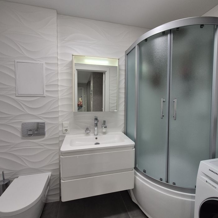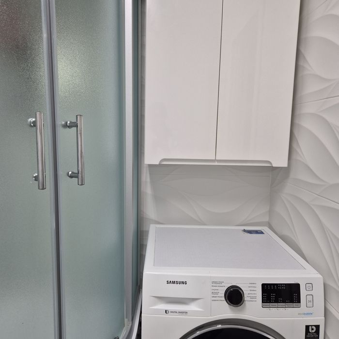 * Санвузол, обладнаний душовою кабіною ,дзеркалом , меблями для зберігання речейта пральною машиною- сушаркою