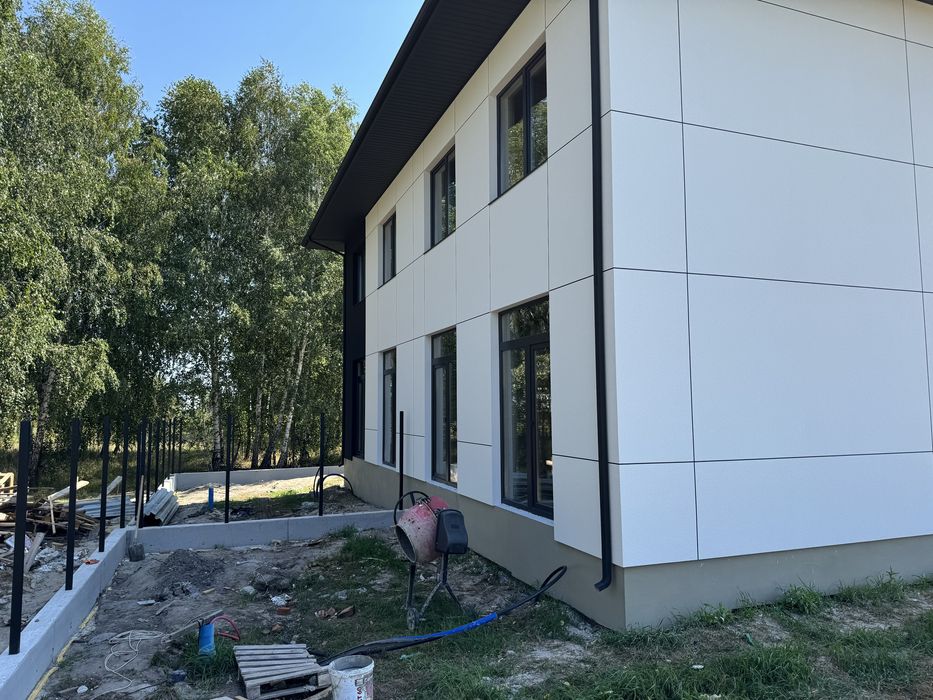- Комбінований фасад: штукатурка + вент фасад з HPL панелями під дерево