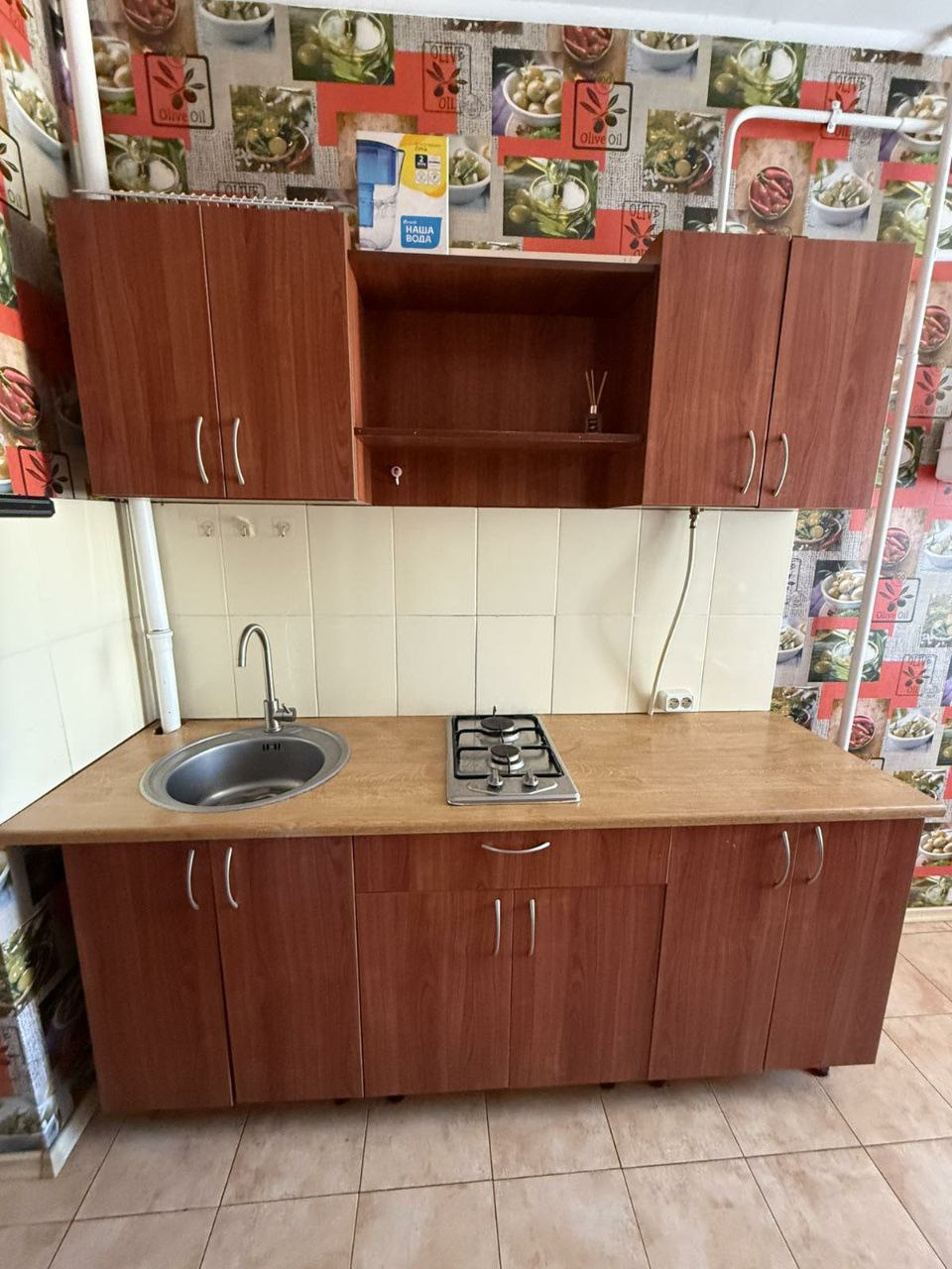 тумба под Тв,зеркальный шкаф,комод,встроенная кухня + обеденный стол + стулья.Есть стиральная машинка автомат,холодильник,2-х контурный экономный котел (свое отопление + горячая вода),Телевизор,кондиционер,газовая варочная панель.Мп-окна,на полу ламинат и кафель,туалет/ванна-облицовка плиткой,бронированные двери,открытый балкон.