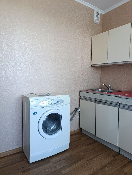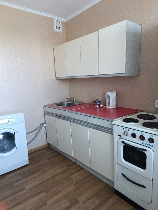 Є меблі та техніка: холодильник, пральна машина, телевізор, пилосос.
