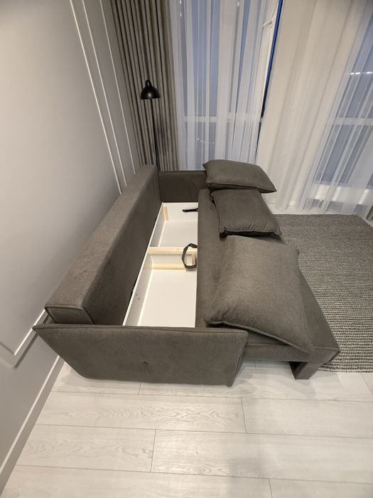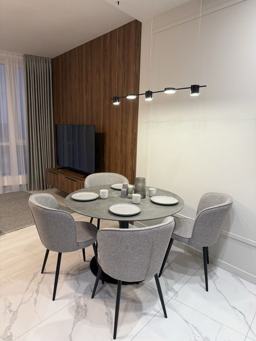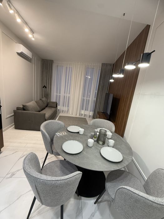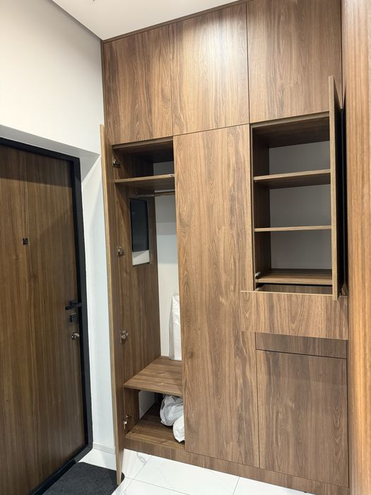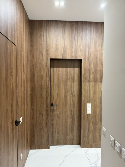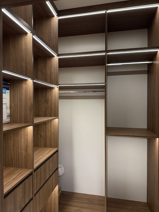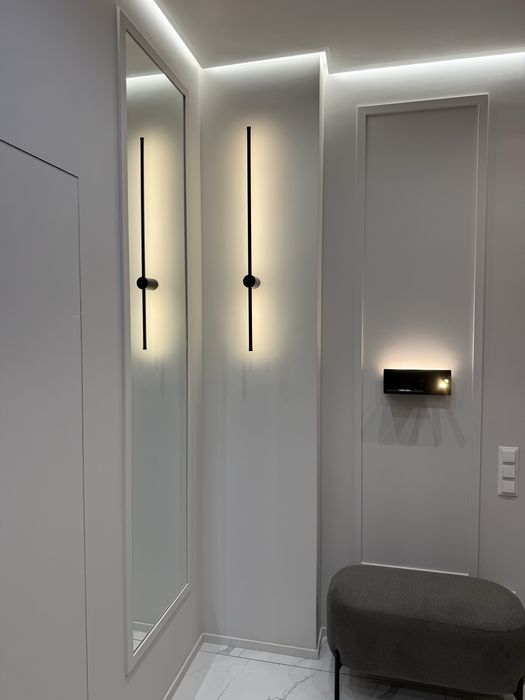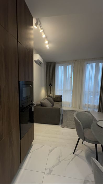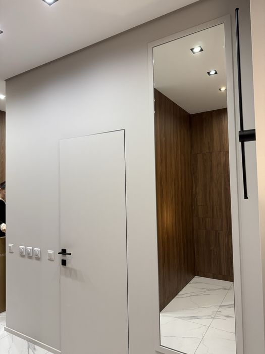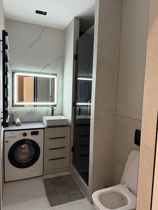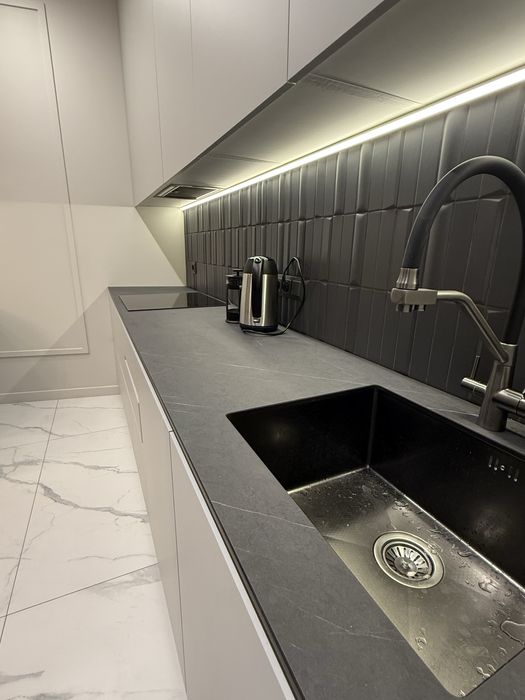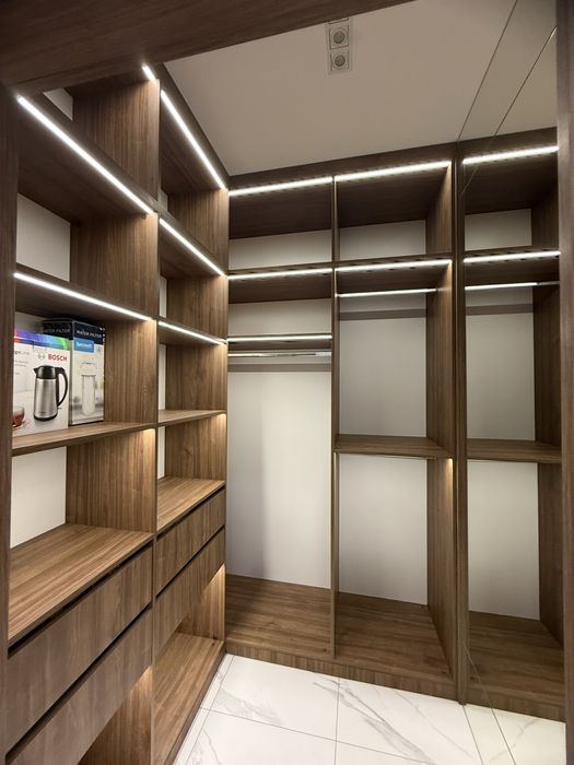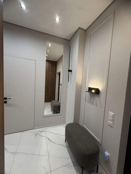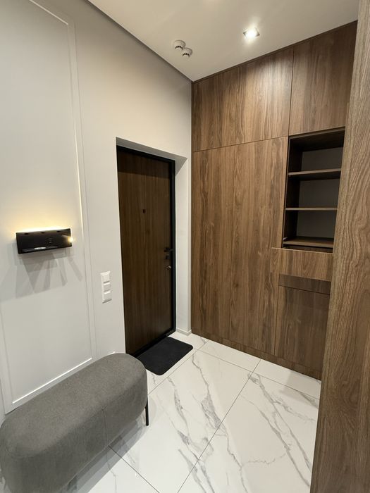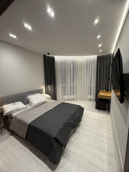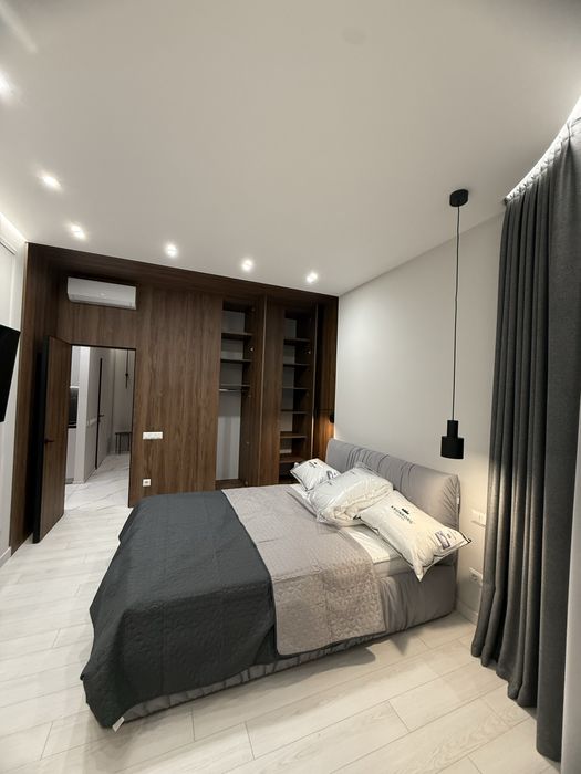 Квартира з сучасним дизайнерським ремонтом, вбудовані шафи, простора кухня-студія, спальня, окрема гардеробна з підсвіткою.