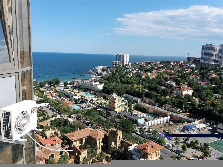 Боковой вид моря и прямой на Аркадийскую алею, фонтан, аквапарк,на город у моря. Панорамное остекление, квартира очень светлая, укомплектована всем необходимым для комфортного проживания и отдыха.
