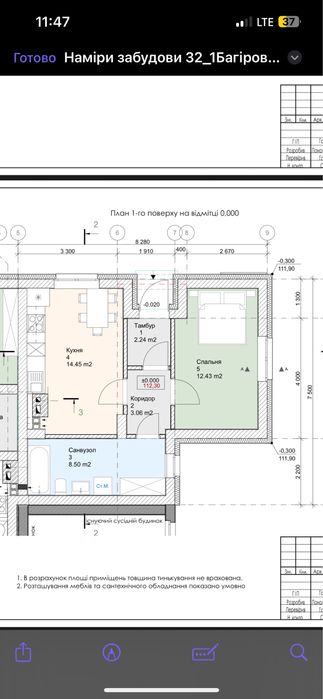 Планування: спальня, кухня-вітальня, санвузол, коридор, тамбур. Можна змінити на