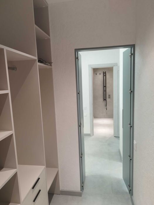 Гардероб обладнаний меблями з зоною для зберігання габаритних речей, є хоз шафа. Також місце для зберігання сушарки для речей, прасувальної дошки, місце для робота пилососа, та місце для аккумуляторного пилососа.